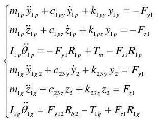 Among them, M1P and m1g are the mass of the input gear pair; R1p and r1g are the base circle radius of the input gear pair; tin is the system input torque; T1G is the input gear torque; y1p and z1p are the vibration displacement of the input stage pinion in the Y and Z directions; y1g and z1g are the vibration displacement of the input stage gear in the Y and Z directions; and θ 1p and θ 1g are the vibration displacement of the input stage gear in the Y and Z directions Is the torsional displacement of the input end teeth to the two gears; K1y and k1z are the equivalent support stiffness in Y and Z directions of the input stage pinion; k23y and k23z are the equivalent support stiffness in Y and Z directions of the intermediate shaft; c1y and c1z are the equivalent support damping in Y and Z directions of the intermediate shaft; c23y and c23z are the Y and Z direction of the intermediate shaft respectively FS1 is the meshing impact force of the input tooth pair.