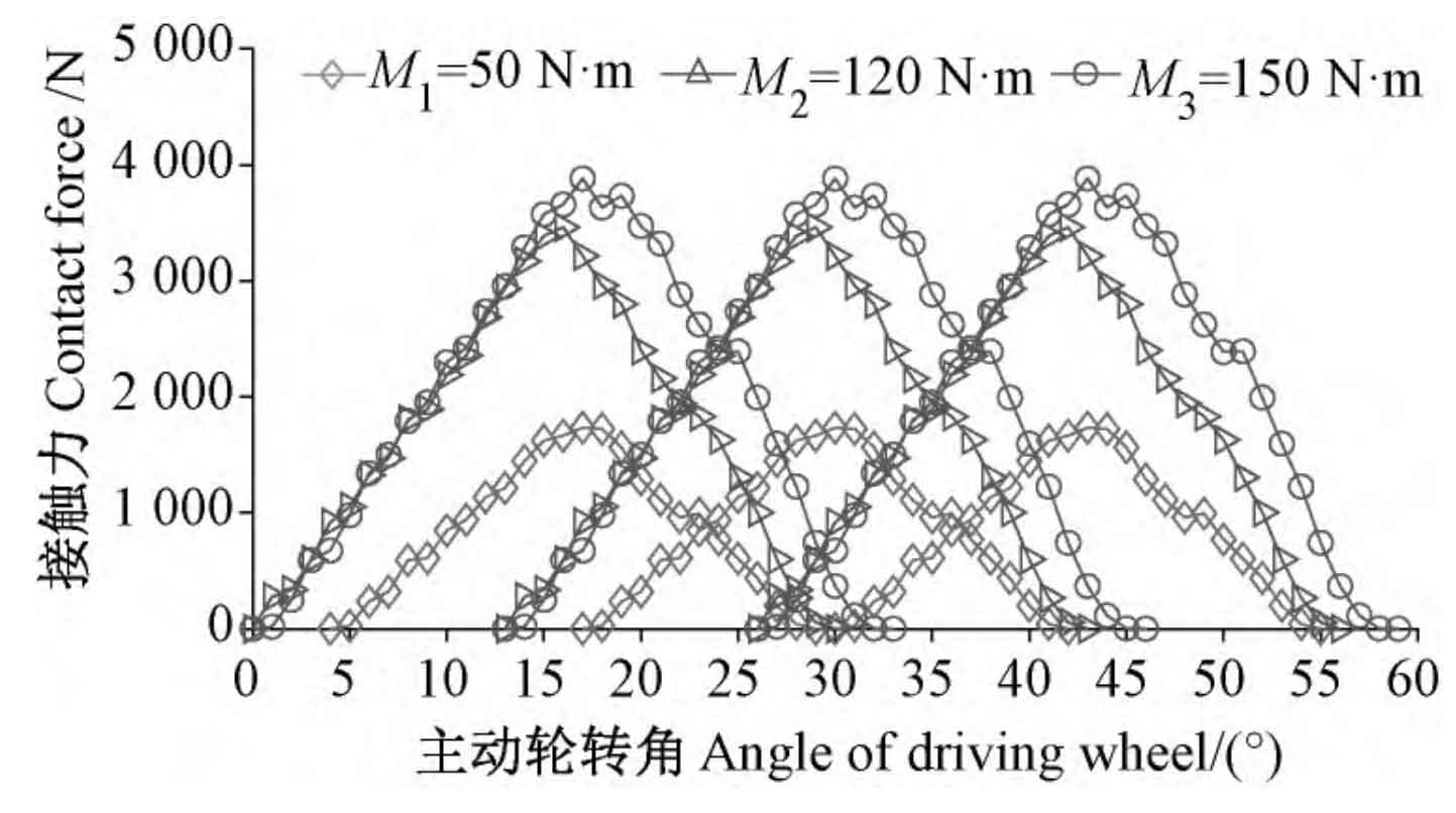 In order to explore the influence of different loads on the coincidence degree, the contact forces of three pairs of teeth under three loads are calculated, and the results are shown in Figure 8. Where, M1=50 N · m, M2=120 N · m, M3=150 N · m. Using the same formula, the coincidence degree under three loads is 1 923, 2.307 and 2 538。 It can be seen that with the increase of load, the coincidence degree of double-arc spiral bevel gear increases.