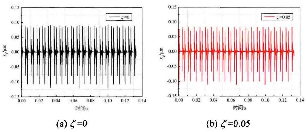 The time-domain response signals of DTE under different damping ratios are plotted in Fig. 3. The time-domain response signals of DTE in Fig. 3 can not directly reflect the influence of damping ratio on DTE. The time-domain response signals of DTE in Fig. 4 are further plotted. The change of DTE curve in Fig. 4 shows that the increase of damping ratio reduces the amplitude of DTE curve, and the attenuation effect of displacement amplitude is the same as that of DTE The curve change of XP in Figure 2 is consistent. It further shows that the damping ratio can not change the stability of the system, but can change the amplitude response characteristics of DTE.