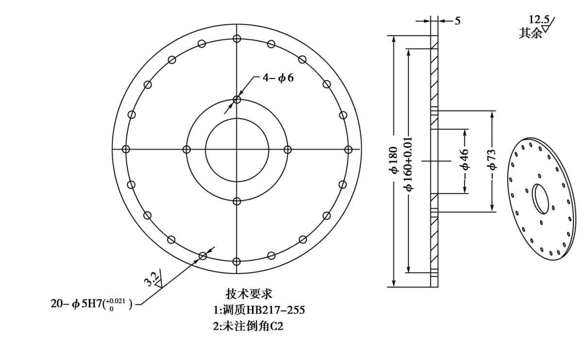 (2) static indexing disc. The design of static indexing disc is shown in Figure 2. This part is used for indexing and positioning of workpiece and is connected with bearing seat, bolt and bolt. There are 20 in the design of static indexing disc- Φ 5H7 pin hole tolerance requirements, because the pin excircle tolerance is Φ 5g6, so the fit between the indexing pin hole of the static indexing plate and the bolt is clearance fit, which is convenient for the assembly, disassembly and positioning of the bolt; 20- Φ The diameter of 5H7 pin hole is Φ 160 ± 0. 01, so the process needs to be arranged to process 20 at the last clamping in the machining center- Φ 5H7 pin hole. 20- Φ The surface roughness of 5H7 inner hole is RA3 2. Therefore, reaming shall be arranged for the process. The material of the static indexing plate is 45# medium carbon quenched and tempered structural steel, which has high strength, good machinability, toughness, plasticity and wear resistance after quenching and tempering treatment.