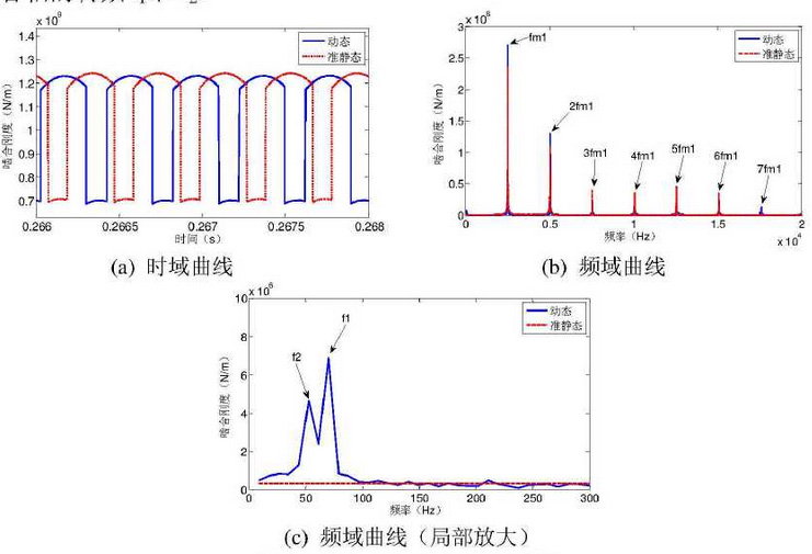 The diagram shows the time-domain and frequency-domain curves of engagement stiffness at rated speed, and gives the time-domain and frequency-domain curves of engagement stiffness under quasi-static conditions (constant speed and theoretical center distance).It can be seen from the diagram that, compared with the quasi-static engagement stiffness, the dynamic engagement stiffness decreases in the single and double teeth engagement area due to the increase of center distance, and at the same time, there is phase difference between the two on the time axis due to the change of gear speed.It can be seen from the spectrum that the dynamic engagement stiffness and the quasi-static engagement stiffness have obvious differences in the corresponding amplitudes on the engagement frequency and its second frequency.Further magnify the spectrum as shown in the figure. The frequency components of the dynamic engagement stiffness also include the frequency sum of each axis.