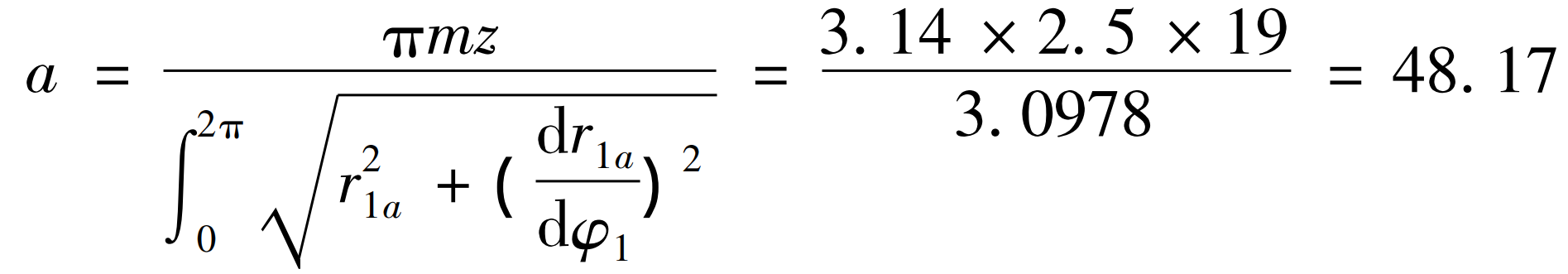 Therefore, the installation center distance of the main and driven gears can be calculated as a = 48.17mm. Because the center distance of noncircular gear has been calculated, the arc length of driving gear pitch curve can be calculated by simultaneous formula, which can be obtained by arc integral formula: