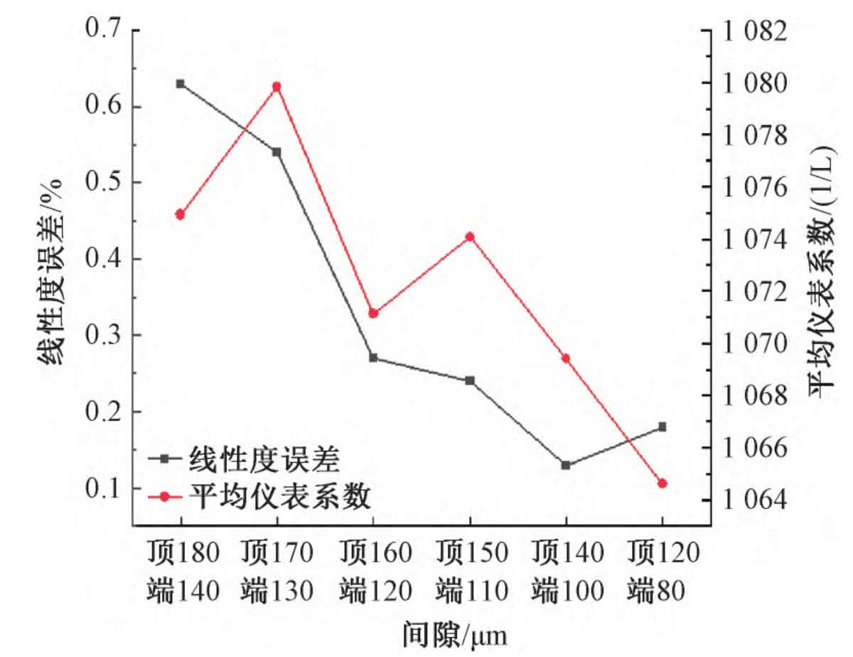 From Figure 6, it can be seen that as the clearance between the tooth tip circle and the end face of the cylindrical gear gradually decreases, the average instrument coefficient and linearity error both show a decreasing trend. The average instrument coefficient is 1074 95 L-1 reduced to 1 064 62 L-1, linearity error from 0 63% decreased to 0 18%, with a change rate of 0 96% and 71% respectively 43%. When the tooth tip clearance is 140 μ m. The end face clearance of cylindrical gears is 100 μ At m, the linearity reaches the optimal value of 0 13%, as the working gap continues to decrease, the linearity error tends to increase, which needs to be explained by the basic theory of fluid mechanics.