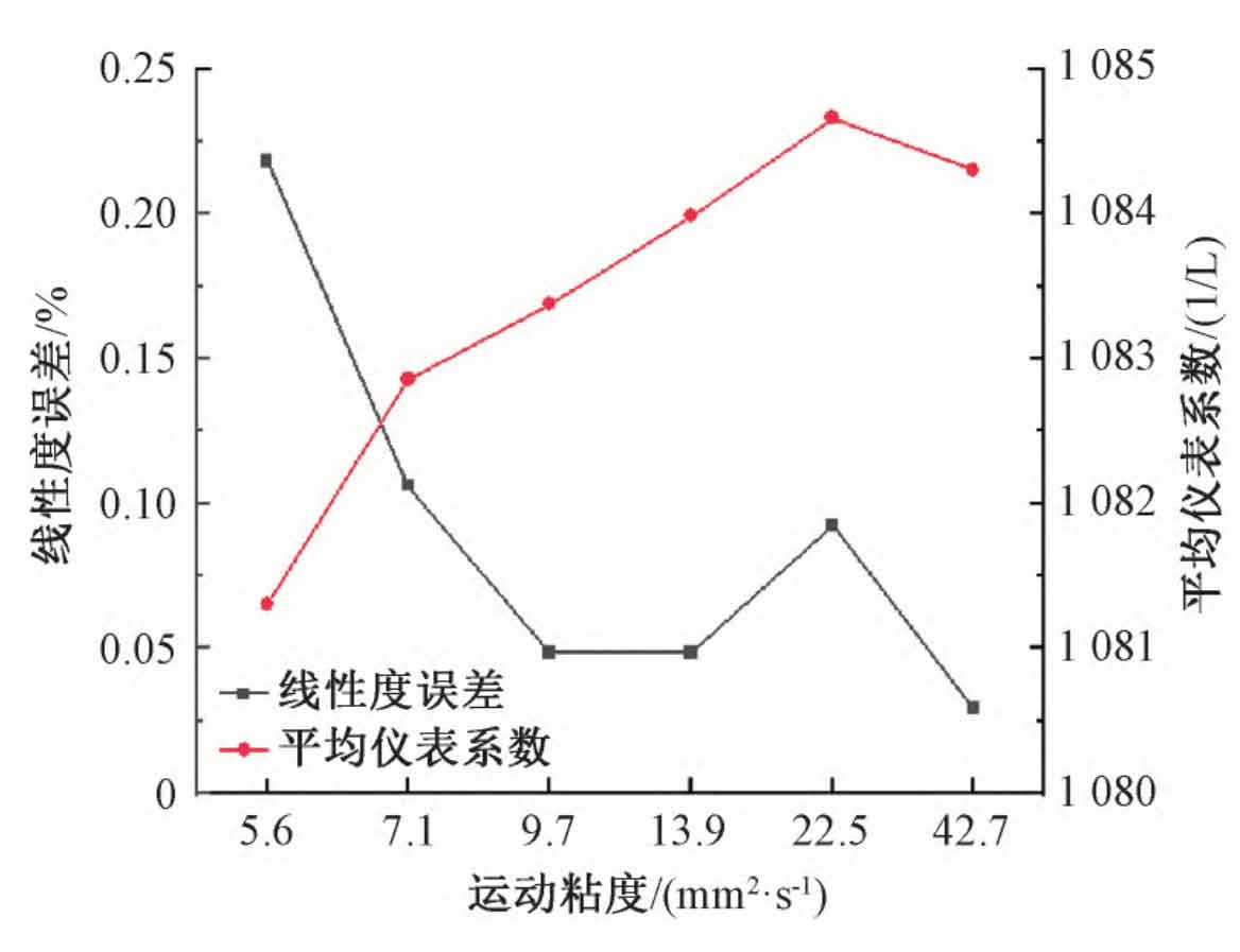 4) The measurement performance of cylindrical gear flow meters is affected by changes in medium viscosity. As the fluid viscosity gradually increases, the linearity error shows a decreasing trend, with a viscosity of 42 At 7 mm2/s, the linearity error is the smallest, only 0 03%.