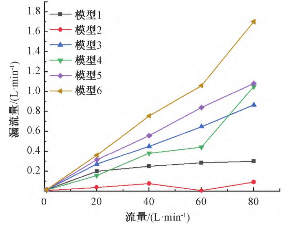 The volume of a single measuring chamber in a cylindrical gear flowmeter is 0 000 460 5 L, discharge 28 chamber volumes per revolution, calculate the theoretical flow rate qt of the cylindrical gear flowmeter using equation (14), and subtract the inlet flow rate qv from the theoretical flow rate qt to obtain the estimated leakage flow rate Δ As shown in equation (15), the leakage flow rate curves of each model with flow rate are shown in Figure 7.