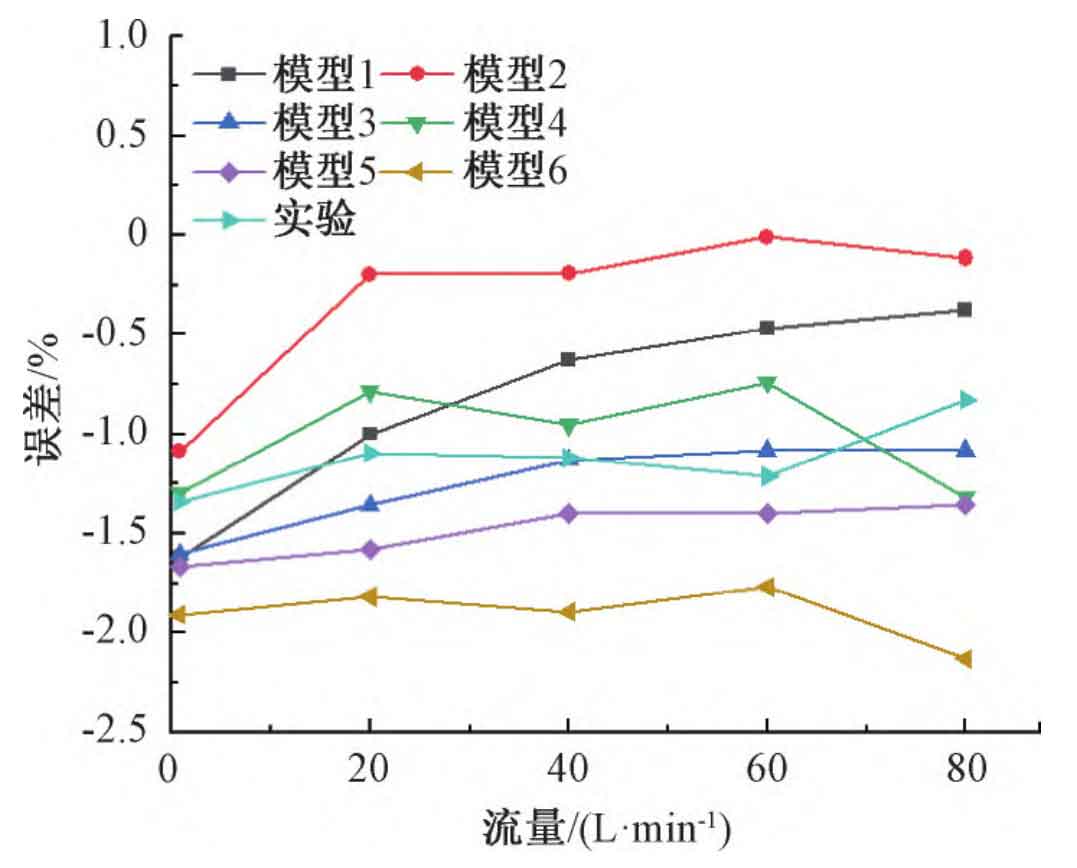 As shown in Figure 7, when the gap of the cylindrical gear flowmeter decreases within a certain range, the leakage flow rate decreases. However, as the gap continues to decrease, the leakage flow rate actually increases, with Model 2 having the smallest leakage flow rate. Further estimate the measurement error caused by leakage in each model, and the curve of measurement error with flow rate variation is shown in Figure 8.