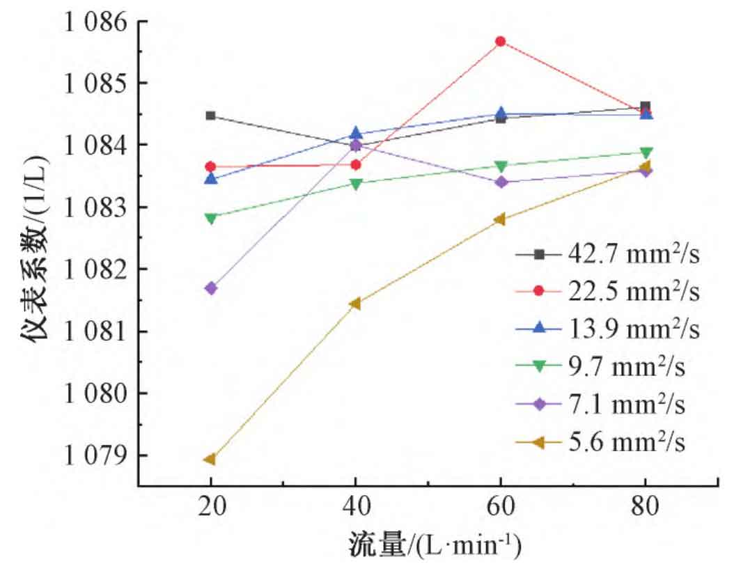 Using the above simulation method, a cylindrical gear flowmeter was tested at 42 7, 22, 5, 13 9, 9.7, 7 Simulate the working performance under viscosity conditions of 1, 5, and 6 mm2/s, using Model 2 with the smallest measurement error as the simulation model. Due to the cylindrical gear flowmeter being at the minimum flow point of 0 The leakage flow rate of 8 L/min is relatively small, and only the simulation results of the other four flow points at 20, 40, 60, and 80 L/min under different viscosity conditions are compared. Calculate the instrument coefficient, average instrument coefficient, and linearity error corresponding to each flow point of the cylindrical gear flowmeter based on the simulation results. The variation curve of instrument coefficient with flow rate under different viscosity conditions is shown in Figure 10, and the variation of average instrument coefficient and linearity error with viscosity is shown in Figure 11.