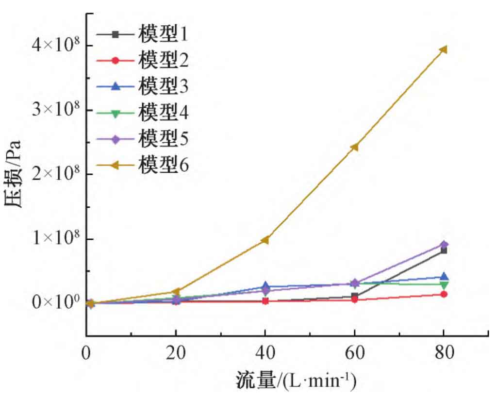 From Figure 8, it can be seen that as the clearance between cylindrical gears changes, the measurement error also changes due to the change in leakage flow rate. Model 2 has the smallest measurement error, with an average absolute percentage error of 0 32%. To explain the effect of assembly clearance on the measurement performance of cylindrical gear flow meters, the pressure losses at the inlet and outlet in the simulated flow field were extracted. The pressure loss curves of each model with flow rate variation are shown in Figure 9.
