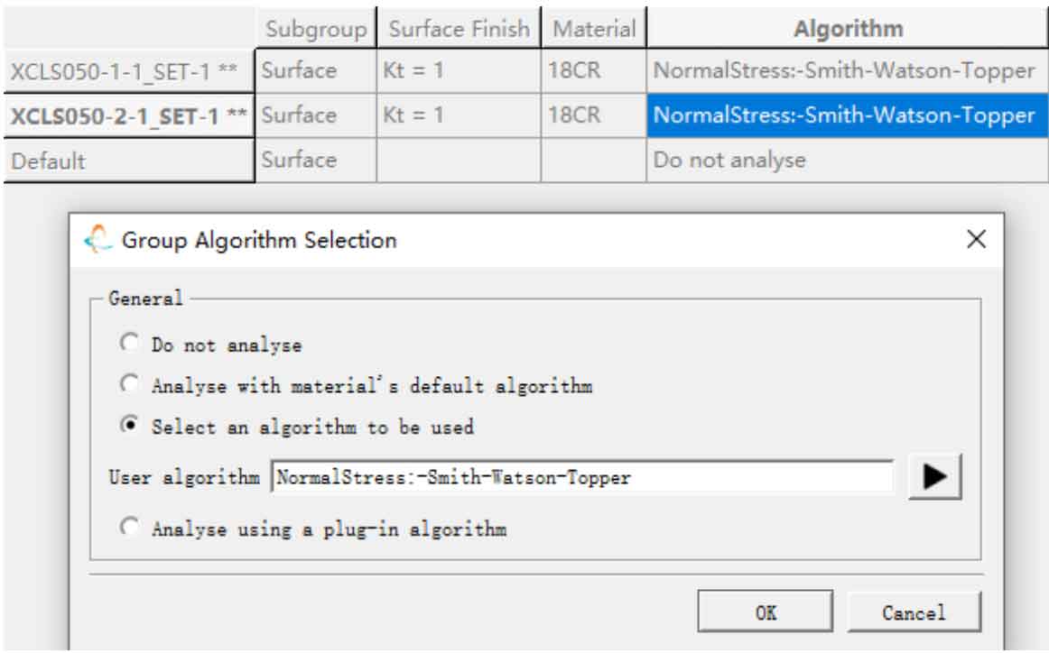 Set the material and fatigue algorithm for the single tooth finite element model of the wheel and pinion gears, and select the Smith Watson Topper method for stress correction, which is suitable for uniaxial high cycle fatigue and the loading mode of static finite element analysis in this chapter. The setting interface is shown in Figure 5, and the FE Safe setting is now completed.