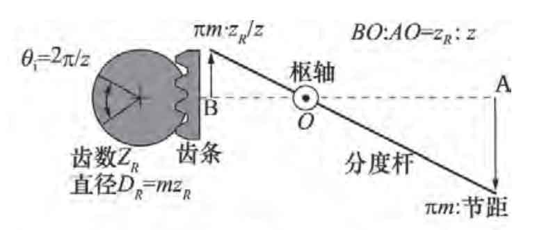 The indexing rod can rotate on the pivot. In addition, the position of the pivot is located by dividing the position Bo: Ao = Zr: Z, where Zr is the number of teeth of the reference gear. When point a moves along the pitch length, point B moves π m · Zr / Z. Point B is connected to the rack, which meshes with the reference gear. Finally, the reference gear rotates θ i. As shown in the formula.