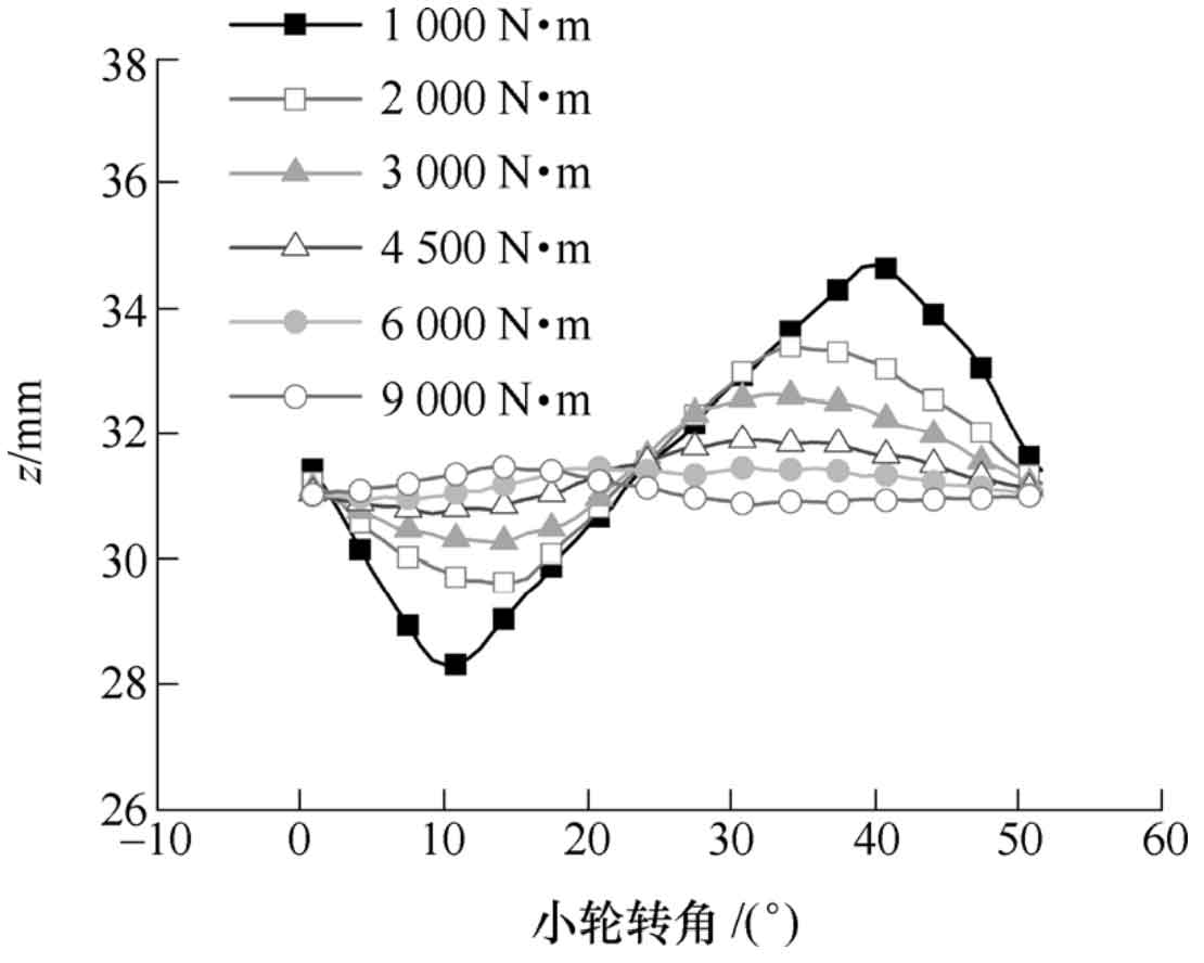 It can also be seen from Figure 9 that the load torque of the large wheel is 1000 n · m、2 000 N · M and 3 000 n · The variation range of tangent stiffness at M is significantly greater than 4500 n · m、6 000 N · M and 9 000 n · According to the coincidence curve in Figure 1, when the load torque of large wheel is 1000 n · m、2 000 N · M and 3 000 n · M, the coincidence degree is less than 2, and the hypoid gear is in the alternating meshing state of 1 to 2 pairs of teeth, when the torque is 4500 n · m、6 000 N · M and 9 000 n · M, the coincidence degree is greater than 2, and the hypoid gear is in the state of alternating meshing of 2 to 3 pairs of teeth. Although the stiffness increases, the variation range of stiffness in one cycle decreases, which has an important impact on the dynamic characteristics of the hypoid gear system.