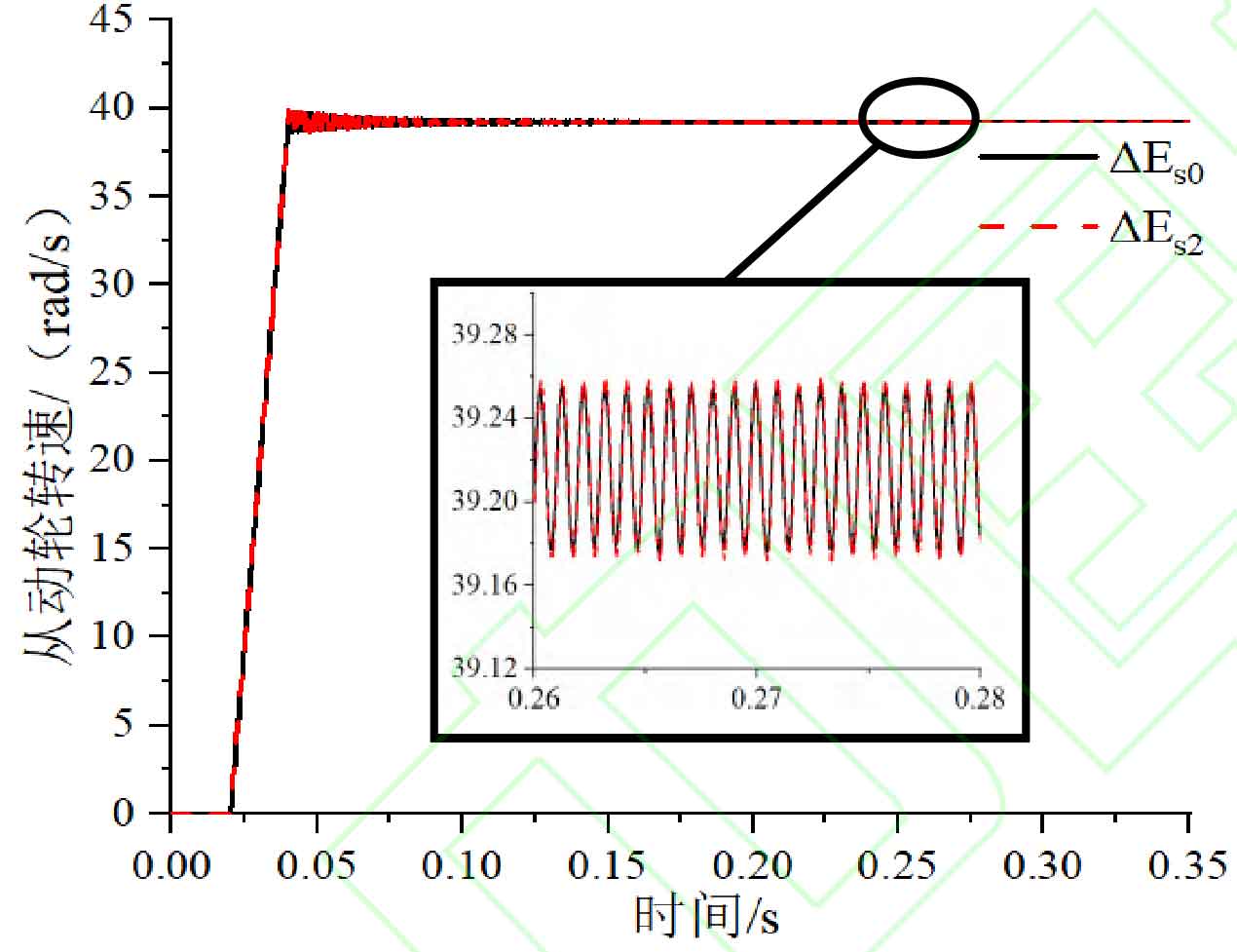 It can be seen from the speed curve of the big gear that the speed of the big gear is stable after the load is stable, which is 39.22 rad / s, the theoretical calculation value is 39.29 rad / s, and the error is only 0.18%, which shows that the simulation result is reliable. At the same time, there is not much difference in the speed curve when there is no tooth thickness deviation and the tooth thickness deviation is △ ES2, but the speed fluctuation is slightly larger when the tooth thickness deviation is △ ES2.