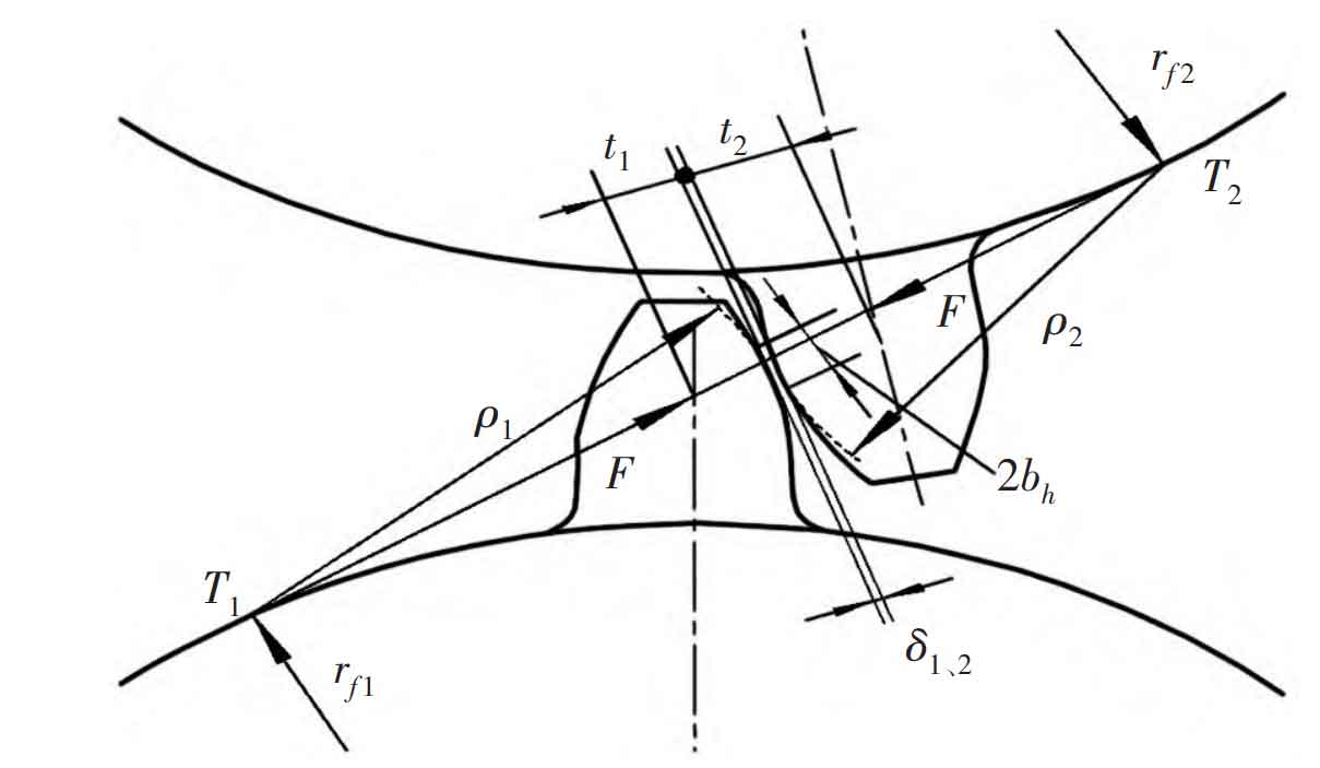 Here, according to Weber – banaschek method and hook formula, the comprehensive elastic deformation of the gear is divided into the deformation of the gear itself, the elastic deformation at the gear root, local contact deformation and Hertz deformation. Generally, under the action of meshing force, the deformation of gear is mainly composed of bending, shear and compression deformation. The cantilever beam model is used to simulate the deformation of gear, as shown in Figure 2. Here, the bending stiffness KB, shear stiffness KS and stiffness Ka caused by tooth root compression are obtained by energy method, which can be calculated by formula respectively. In addition, the Hertz deformation of the gear should be considered when calculating the tooth deformation, as shown in Figure 3. That is, the Hertz contact stiffness KH needs to be added when calculating the meshing stiffness of the system, which can be calculated by the formula.
