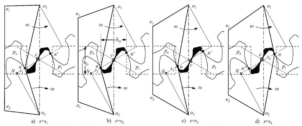 The trapping process and meshing process of the gear micropump are completely consistent with those of the commonly used gear pumps, as shown in Fig. 1, where.., □, ○ or n denote the positions of the meshing point, the backlash point and the end point of the theoretical meshing line; O1, O2 are the main and secondary gear centers; Figures 1a to 1D respectively show the transmission position when (n) is the vertex of O1 tooth, □ (c) is the node, (n ‘) is the vertex of O2 gear and. (n ″) is the vertex of O1 tooth. Figures 1a-1d and 1a-1c respectively describe the meshing process and oil trapping process. If the length of × (n). (n) is s, s corresponding to Fig. 1a-1d is S1-S4; the trapped oil volume, volume change rate and trapped oil pressure are V, DV, P, respectively
