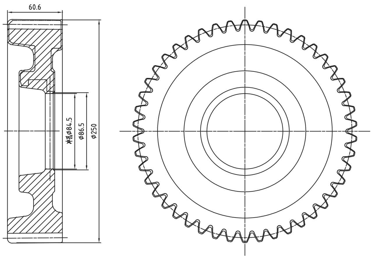 As can be seen from the above part drawing, the maximum outer circle of this part is φ 248mm, tooth width of 58mm, modulus of 5.22mm and number of teeth of 46. It is a typical large specification and large modulus spur gear part. In order to ensure the yield, the tooth part is designed with a margin of 1mm on one side and 1.3mm on the other side. At the same time, considering the die out problem, the die out angle at the outer circle is 0.5 °, and the straight tooth cylindrical gear forging is shown in Fig. 2.