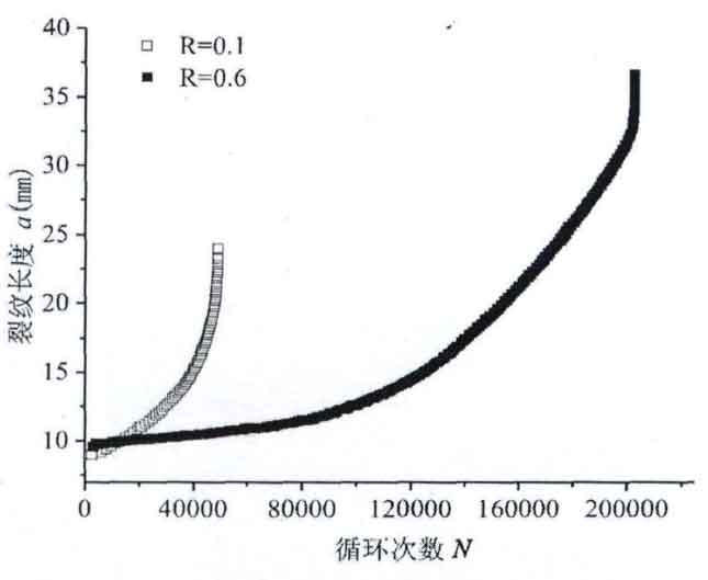 At the formal beginning of cyclic loading, the crack length tends to increase when the stress ratio is 0.1 and 0.6. When the stress ratio is 0.1, the crack length increases faster with the increase of the number of cycles, and the number of cycles is less under the same crack length. The crack length increases sharply when the number of cycles reaches about 50000, and the data acquisition point disappears, which proves that the fatigue failure of the specimen occurs at this time. According to the test data, the fatigue life of the specimen is 48913 cycles, and the crack length at this time α= 24.05mm; When the stress ratio becomes 0.6 under the same other conditions, the growth rate of crack length is slow. To reach the same stress ratio r = 0.1 and the same crack length, the number of cycles is more. When the number of cycles is 80000 times, the crack hardly expands. After 80000 times, the crack presents the growth form of positive proportional function. When the number of cycles is about 200000, When the number of cycles continues to accumulate, the crack length increases rapidly, resulting in the failure of the sample. According to the test data, the fatigue life of the specimen is 203587 cycles, and the crack length at this time α= 35.94mm。 Due to the different stress ratio, the crack length of the two curves is different with the increase of the number of cycles, but the development trend of the two curves is the same.