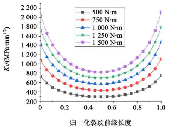 After the three-dimensional model of the gear is established, the material used in gear simulation is 17CrNiMo6, and then the helical gear pair model with semi elliptical initial crack is created. Taking the radius of the major and minor axes of the semi elliptical as 1 mm, the boundary conditions are imposed on the gear pair, and only the degree of freedom of the driving gear in the direction of rotation to be applied torque is retained, and the rest are constrained. The torque of 500 N · m, 750 n · m, 1 000 n · m, 1 250 n · m and 1 500 N · m was applied to the driving wheel respectively, and then the stress intensity factor and J-integral of the three-dimensional crack front were calculated. Figure 1 shows the curve distribution of three-dimensional stress intensity factors under different loads, and Figure 2 shows the numerical distribution of J-integral under different loads on the driving wheel. In order to explore the variables of initial 3D crack parameters simply and accurately, the crack leading edge length is normalized.
